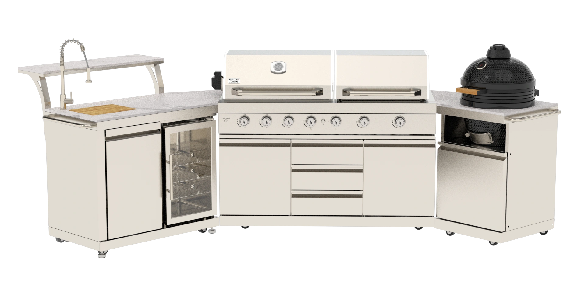 - Full Outdoor Kitchen Amenities – Built-in sink, refrigerator, storage, and included accessories (model dependent).