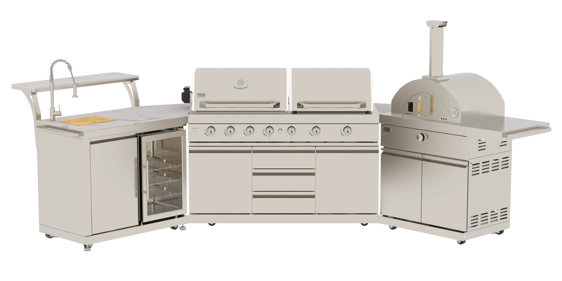 Bring professional performance and modern elegance to your backyard with this stainless steel U-shaped island suite. Featuring a gas grill, griddle, and a 18-inch artisan pizza oven, it’s crafted from SS304 stainless steel with weather-resistant white sintered stone countertops for year-round entertaining.
